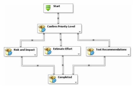 The main Change Request Process (shown above) also calls a sub process at "Perform Impact Assessment" step. The sub process contains tasks for Risk Management, Effort Estimation and Testing Recommendations which can execute in parallel. Once completed, information is passed back up into the main process. The solution has the ability to model each step in the Change Management model as seperate sub process. This feature is a powerful tool as it allows the organization to model complex change request processes by breaking them down into smaller, more manageable processes.